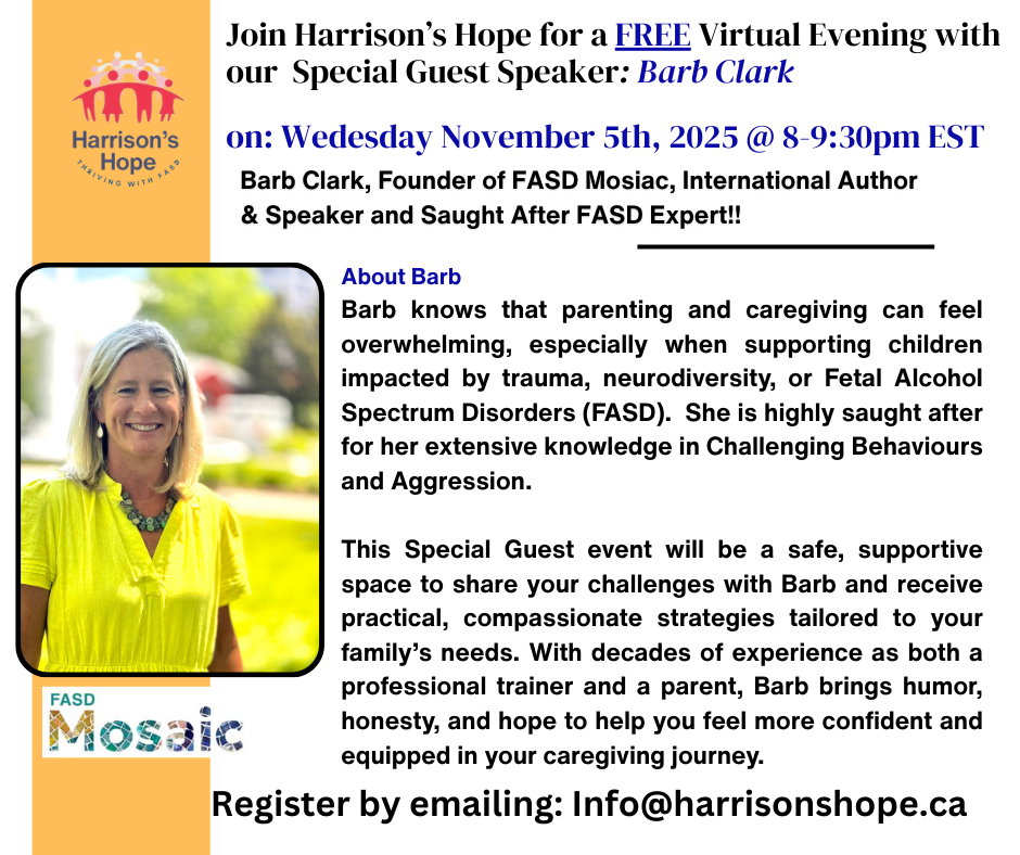 On Wednesday November 5th from 8-9:30pm EST, we have our FREE Monthly Virtual Webinar -Special Guest Speaker: Barb Clark, Author, Caregiver, and Highly Sought FASD Expert who specialized in the 3 Most Challenging Symptoms of FASD: the swearing, the lying, and the stealing. If you have questions and concerns on these 3 topics, you need to attend this webinar. See attached flyer for full details.